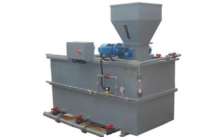聚合物溶液制備過程是通過各個溶液箱分級逐步處理完成的.溶液箱之間隔開。保證每個溶液箱內(nèi)的最佳反應時間和恒定的濃度.避免在預制箱和最終溶液箱之間產(chǎn)生任何直接通路。該設(shè)備由控制箱自動控制.此控制箱與安裝在最終溶液箱上的液位計相連.一旦液位達到“低位”,觸發(fā)電動進水閥打開。觸點式流量計就啟動干投機.干投量的大小按照水量而定,以獲取精確的濃度,一旦達到“高位”此循環(huán)過程就停止。當然兩(或三個)攬拌器還在工作。該設(shè)備還用于將乳膠狀的陽離子、陰離子或無離子型的聚合物連續(xù)自動的制成標準稀釋濃度(0.3-5g/L)的溶液。盡管一般認為乳膠狀的聚合物制成標準溶液所需的熟化時間大大少于粉粒狀聚合物,但是在將藥耗達到最佳狀態(tài)過程中總是推薦要充分的熟化時間。